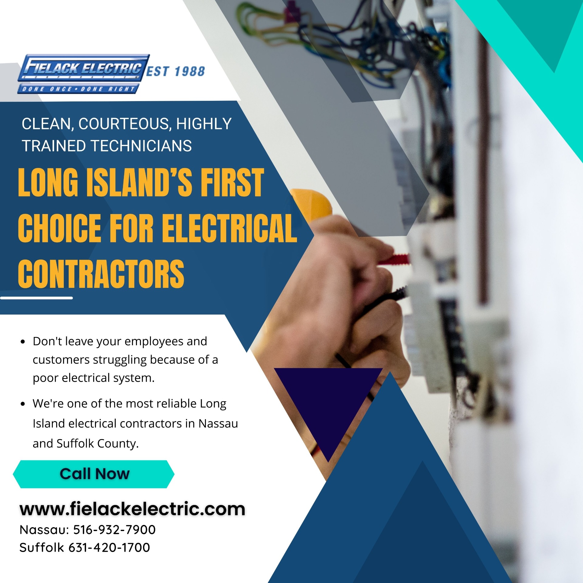 When you're in need of an Electrician in Farmingdale, NY, or the surrounding areas, look no further than Fielack Electric Corporation. As trusted Electrical Contractors, we offer a wide range of services to meet all your electrical needs. Whether you're searching for an Electrician near me or Electrical Contractors near me, Fielack Electric Corporation is the name you can rely on for quality and professionalism. Our team provides exceptional Electrical Service, ensuring that every job is completed safely and efficiently. If you're looking for Electrical Service near me, Fielack Electric Corporation is here to help.